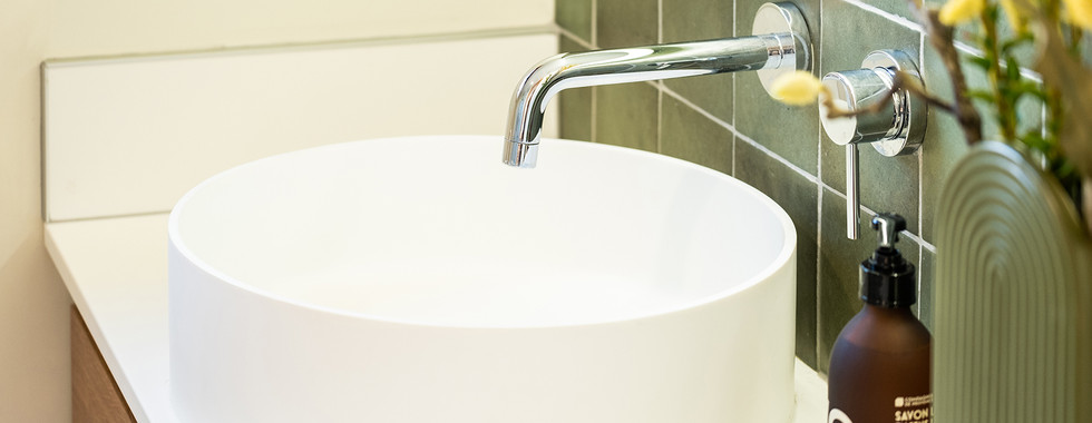For the floor tiles we went for a natural look that was complemented by the tile colours. We chose green feature tiles for the upstairs ensuite and blue for the downstairs ensuite. The timber vanities added to the nature feel and complimented the existing woodwork, and we added a matt white top mount basin and countertop. The use of matt white rather than gloss is an on-trend choice. Another trend that we went for is the position of the spout and mixer coming from the wall rather than mounted on top of the basin.